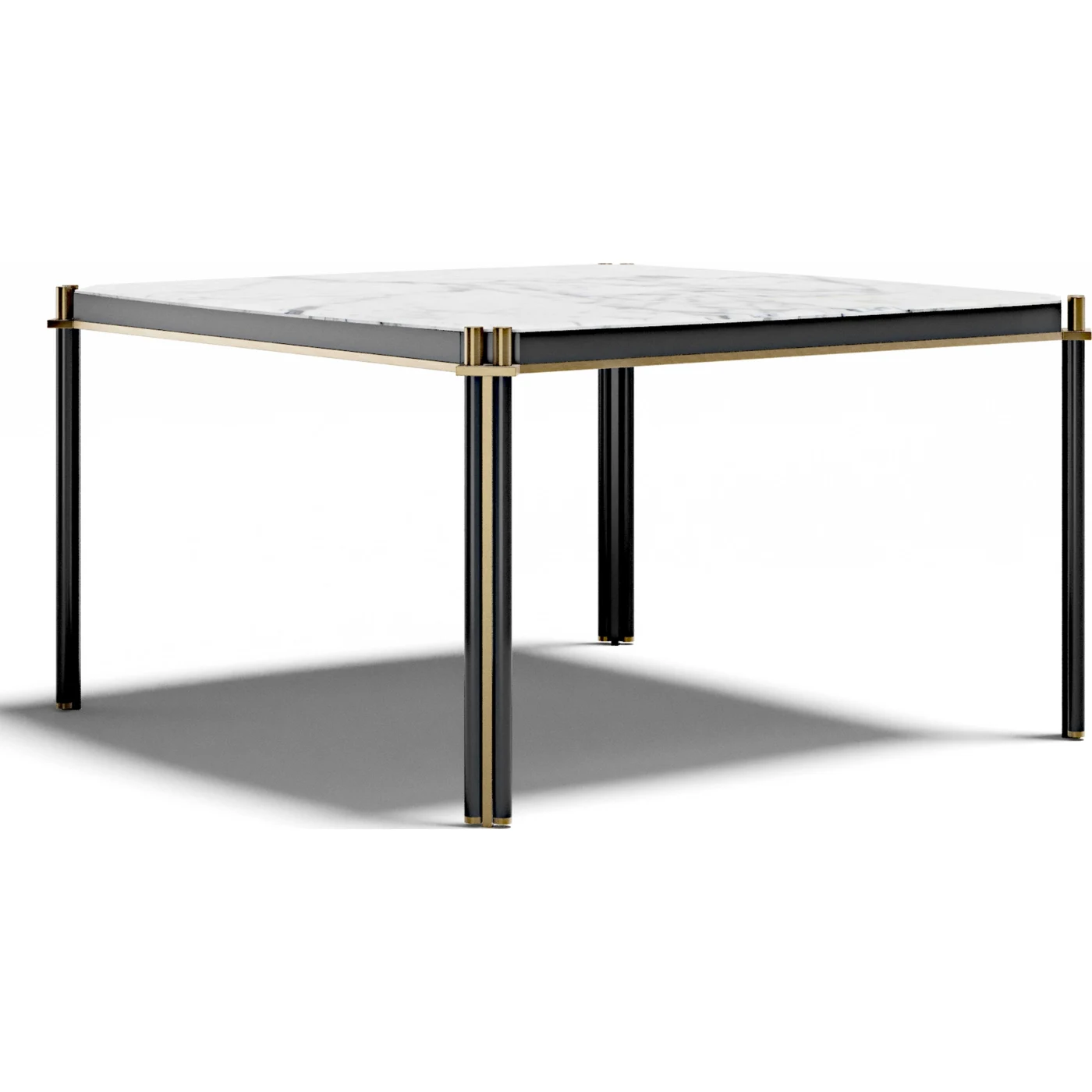 Tudor Q presents a square table featuring both marble and wooden elements, blending luxury with natural warmth. The Tudor series offers a wooden table available with either a wooden or marble top, providing versatility to suit your preferences. Its round section legs are finished in metallic detailing, adding a touch of sophistication to its design. With dimensions of L 155 x W 155 x H 76 cm, it offers ample space for gatherings and dining experiences.