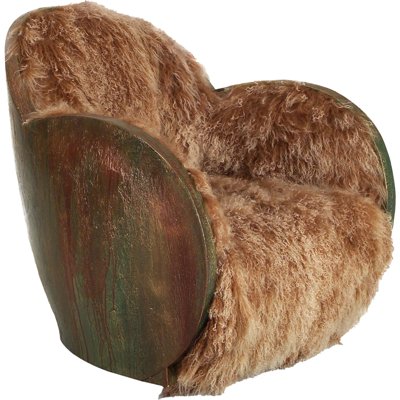 Carlo Rampazzi created this comfortable egg-shaped swivel armchair, which is enhanced by "Mongolian" fur upholstery and a hardwood backrest with a material finish reminiscent of tree bark.
