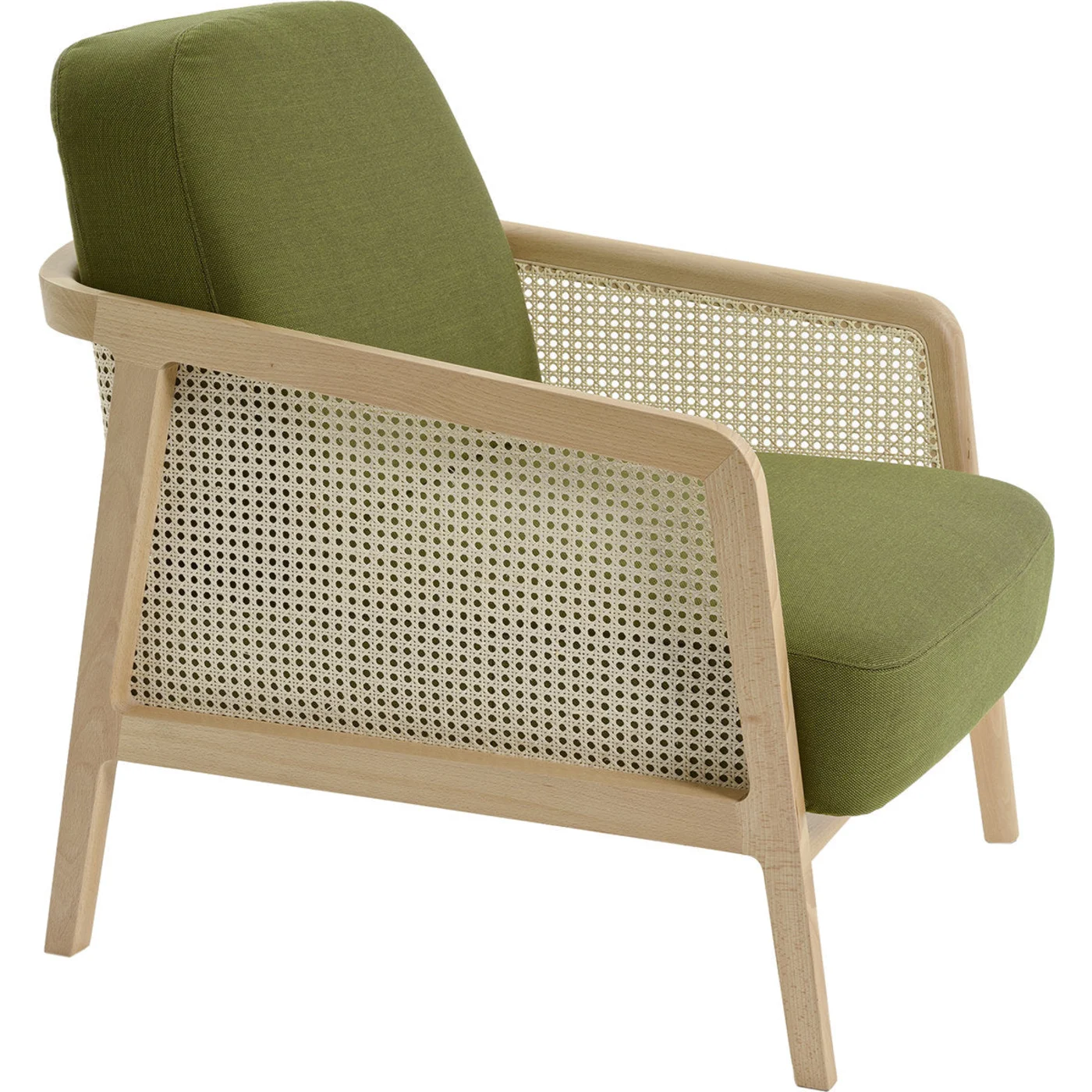 Drawing inspiration from Viennese designs of the 1850s, this elegant armchair blends aesthetic appeal with practical functionality. It boasts a robust construction made of solid beech wood and straw, enhanced by soft foam padding in different densities for added comfort. The chair is upholstered in red-dyed wool, which is removable for convenient cleaning and maintenance.