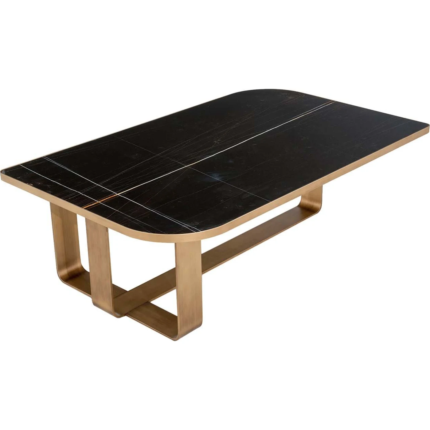 Combining the timeless elegance of a bronze finish with the unparalleled allure of marble, this coffee table becomes a sculptural centerpiece that exudes sophistication and boldness, making it perfect for modern interiors. Its metal structure boasts thick legs that intersect at the base, with rounded corners mirroring those of the rectangular top. This top showcases a stunning black marble slab, adding a touch of luxury to the design. Additionally, the metal can be finished in silver, and the top can be customized with a mirror—details available through our Concierge service.