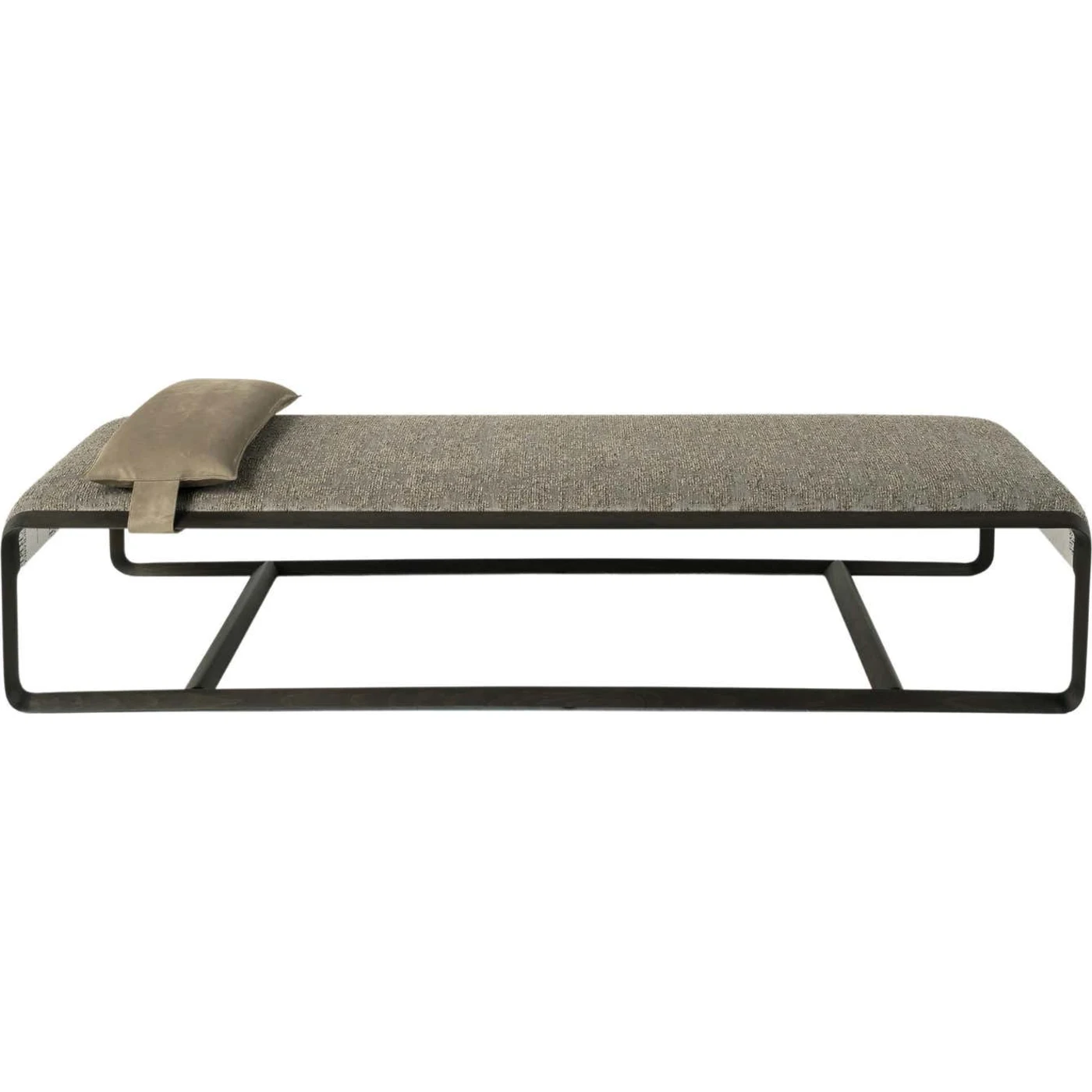 The Wynwood daybed features a sleek, minimalist design that not only provides extra seating but can also function as a subtle room divider when needed. This piece beautifully balances style and comfort, showcasing a slender frame accented by the Smokey Grey hues of both the wood structure and the fabric upholstery. Its solid beech wood structure is shaped with variable sections, irregular curves, and finger joints, seamlessly connecting to the seat with hidden pins. The support beam is crafted from solid beech wood dyed Smokey Grey, shaped in varied sections, and securely attached to the structure using finger joints. The seat features a curved multilayer poplar wood frame with elastic webbing for optimal springiness. It is cushioned with expansive polyurethane foam and Dacron, and upholstered in the fabric category A Heavy Winter (Woven) 22.06 in a soft Taupe shade. The cushion is filled with variable thicknesses of expansive polyurethane foam and goose down, and is upholstered in category B leather, Nabuk L.08.04 Dove.
