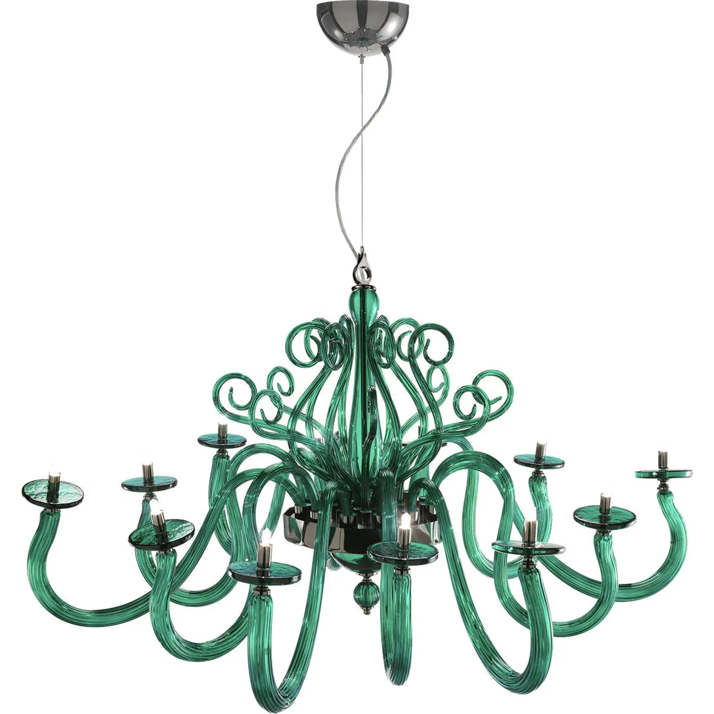Crafted with materials from Veneto and Tuscany using traditional glass-crafting techniques, this innovative chandelier by Euroluce stands out. It is supported by a metal hook and cable finished in black nickel, featuring a circular metal center with a sleek black gloss finish. Delicate green crystal scrolls adorn the center, framing the holding pole. Twelve graceful green glass arms elegantly curve outward, tapering to small plates with light bulbs. Simple yet elegant, this contemporary piece is designed to enhance any modern interior. Customization options are available for sizes and colors.
